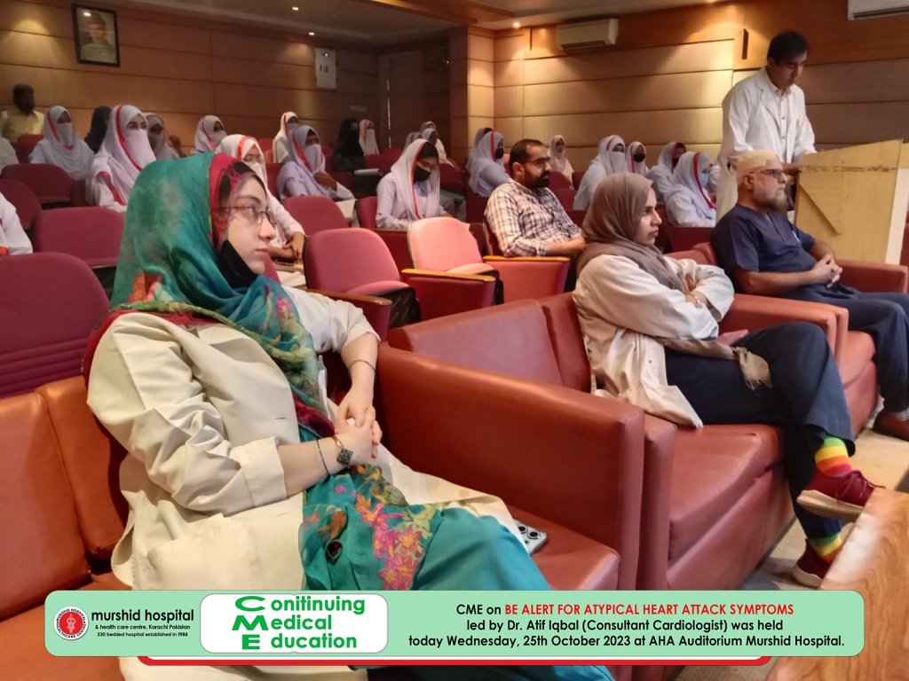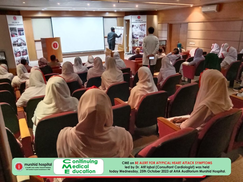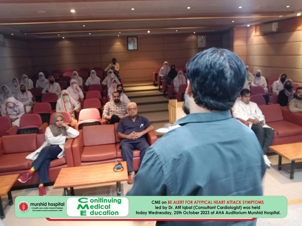 October 25, 2023 Comment: 0 Uncategorized CME (Continuing Medical Education) on BE ALERT FOR ATYPICAL HEART ATTACK SYMPTOMS led by Dr. Atif Iqbal (Consultant Cardiologist) was held today Wednesday, 25th October 2023 at AHA Auditorium Murshid Hospital.