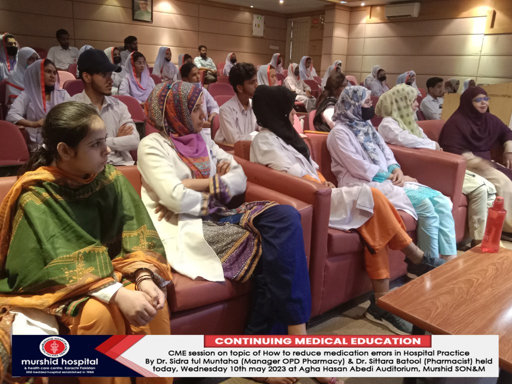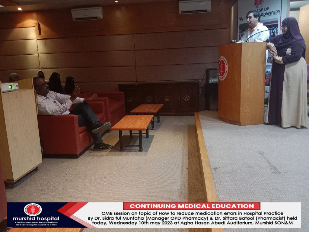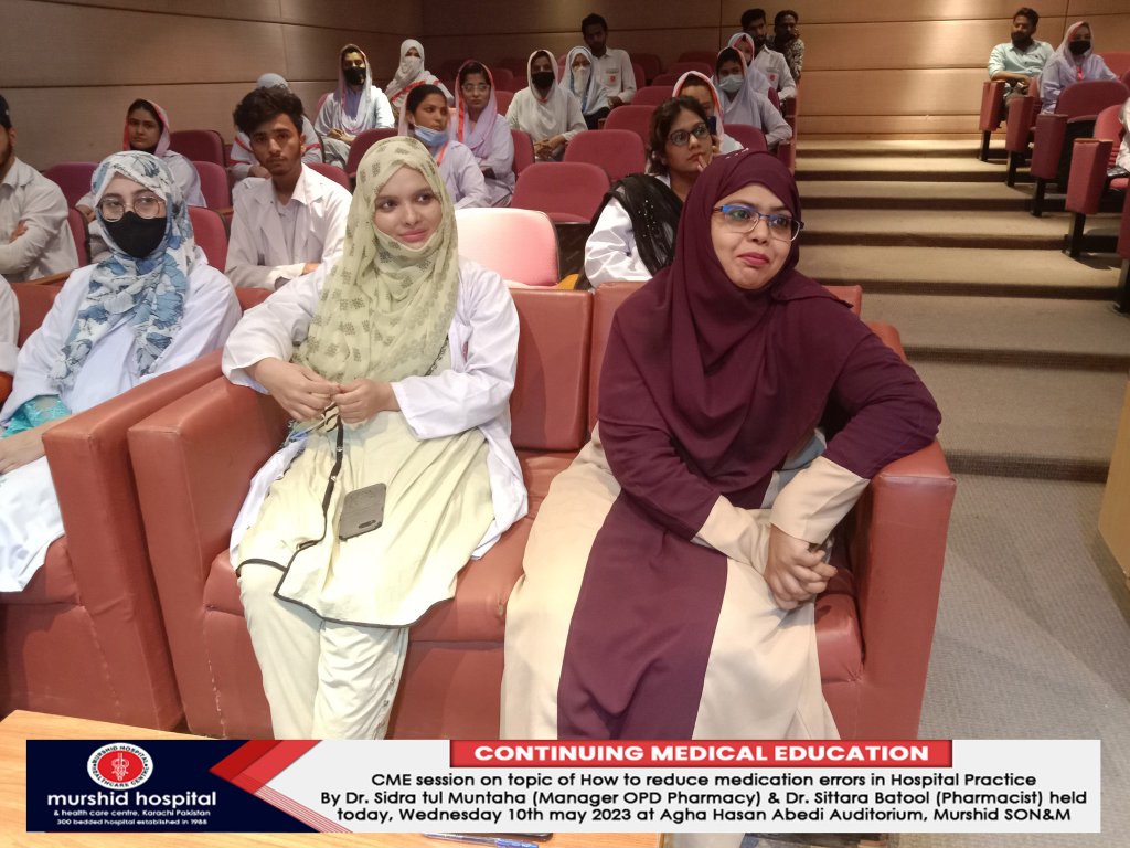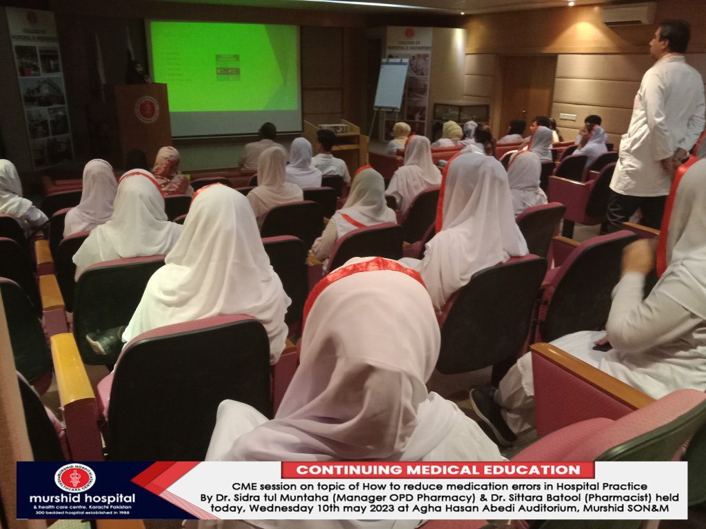CME session on topic of How to reduce medication errors in Hospital Practice By Dr. Sidra tul Muntaha (Manager OPD Pharmacy) & Dr. Sittara Batool (Pharmacist) was held Wednesday 10th may 2023 at Agha Hasan Abedi Auditorium, Murshid SON&M.
