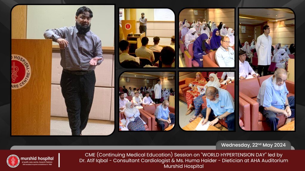 May 22, 2024 Nadeem Sarwar Comment: 0 Uncategorized CME (Continuing Medical Education) Session on “WORLD HYPERTENSION DAY” led by Dr. Atif Iqbal – Consultant Cardiologist & Ms. Huma Haider – Dietician on Wednesday, 22 May 2024 at AHA Auditorium Murshid Hospital