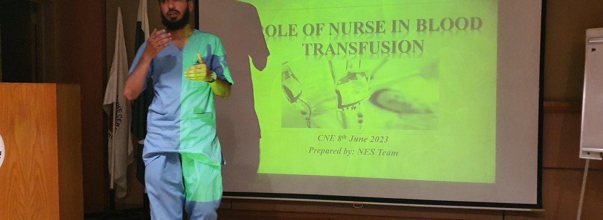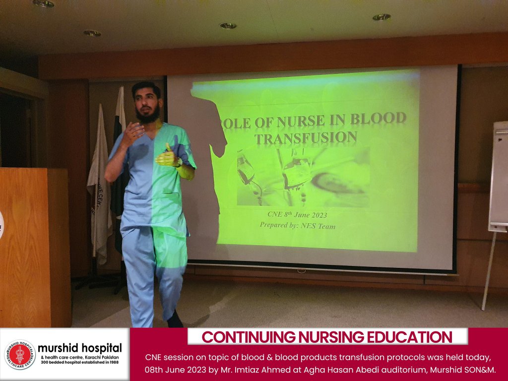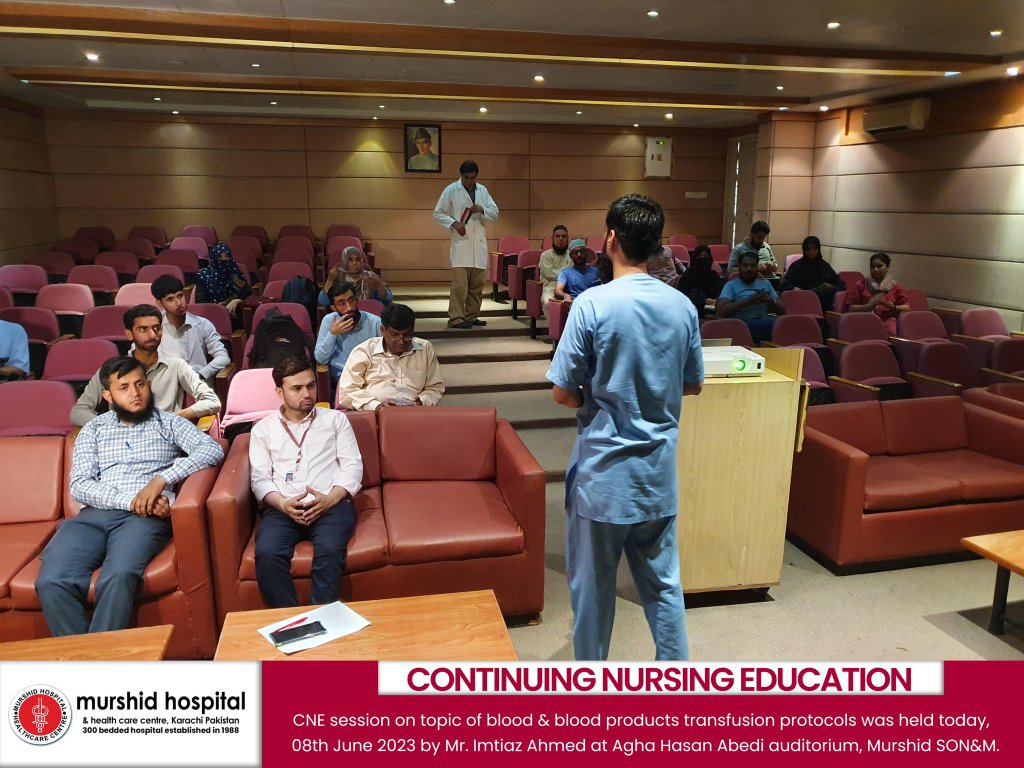 CNE session on topic of blood & blood products transfusion protocols was held on today, 08th June 2023 by Mr. Imtiaz Ahmed at Agha Hasan Abedi auditorium, Murshid SON&M.