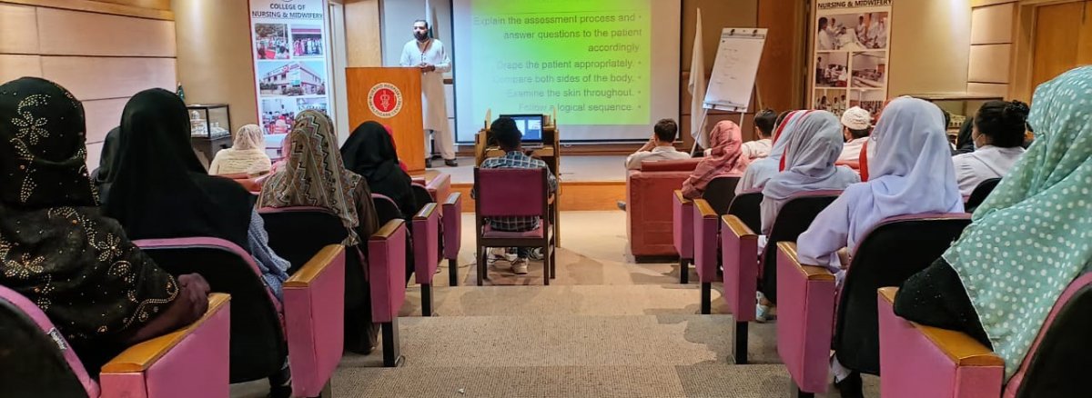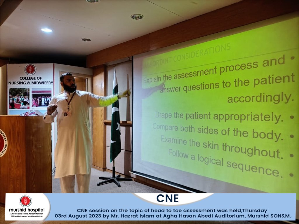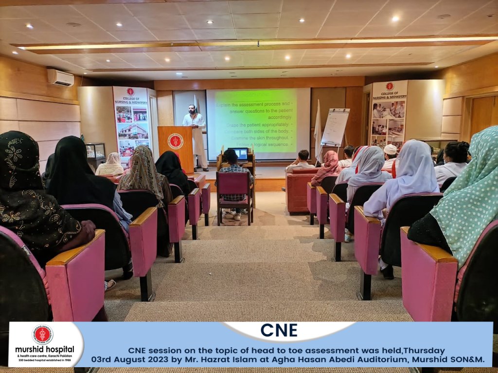 CNE session on the topic of head to toe assessment was held today, Thursday 03rd August 2023 by Mr. Hazrat Islam at Agha Hasan Abedi Auditorium, Murshid SON&M.