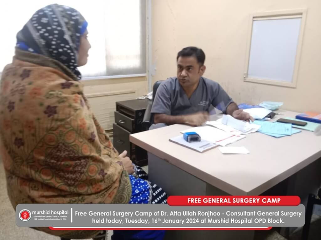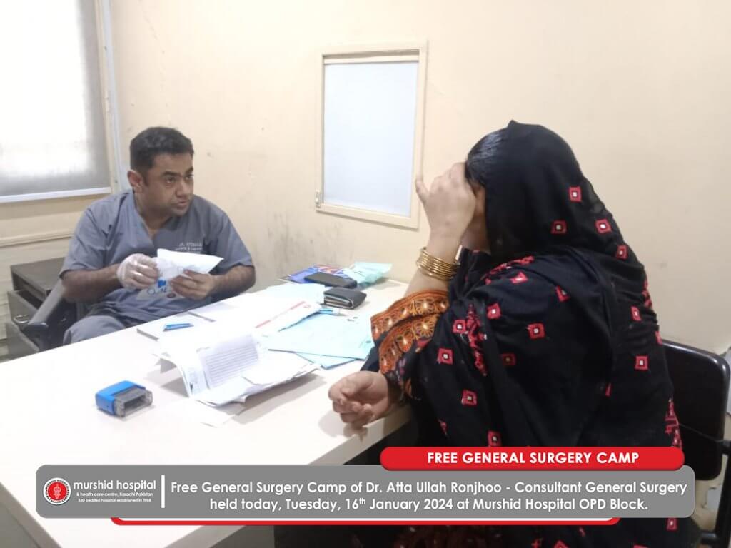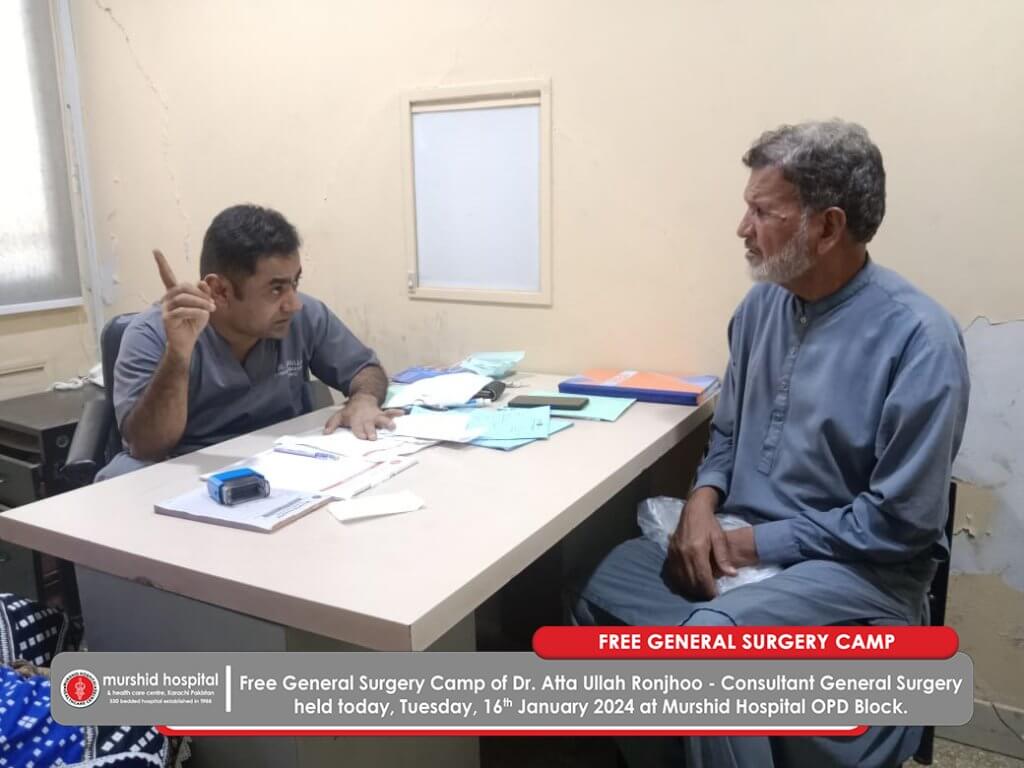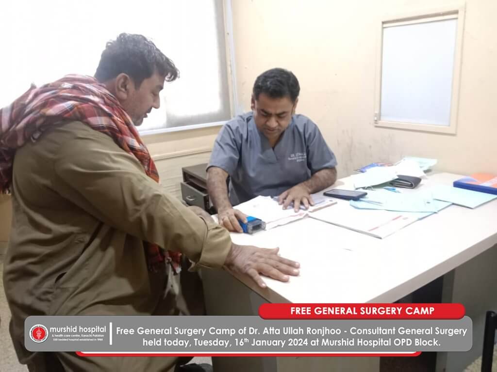 January 16, 2024 Nadeem Sarwar Comment: 0 Uncategorized Free General Surgery Camp of Dr. Atta Ullah Ronjhoo – Consultant General Surgery held today, Tuesday, 16th January 2024 at Murshid Hospital OPD Block.