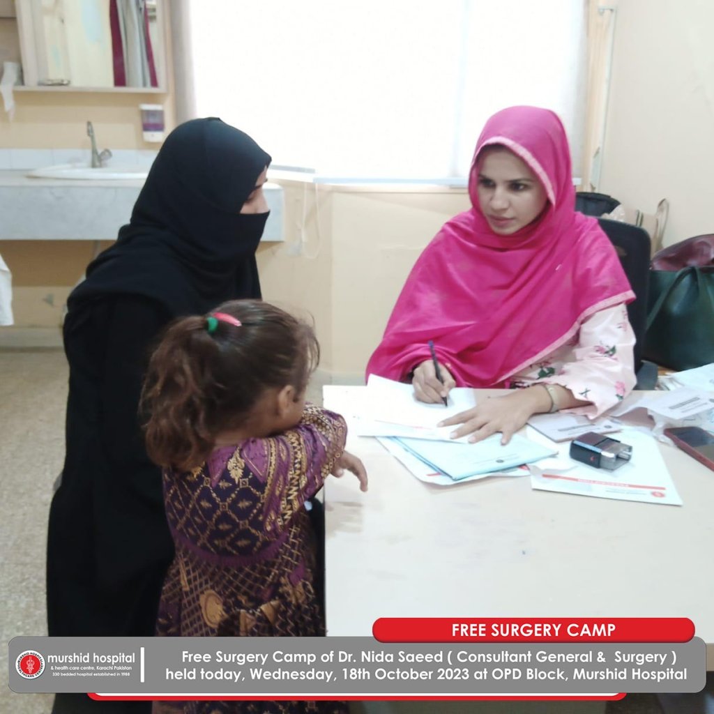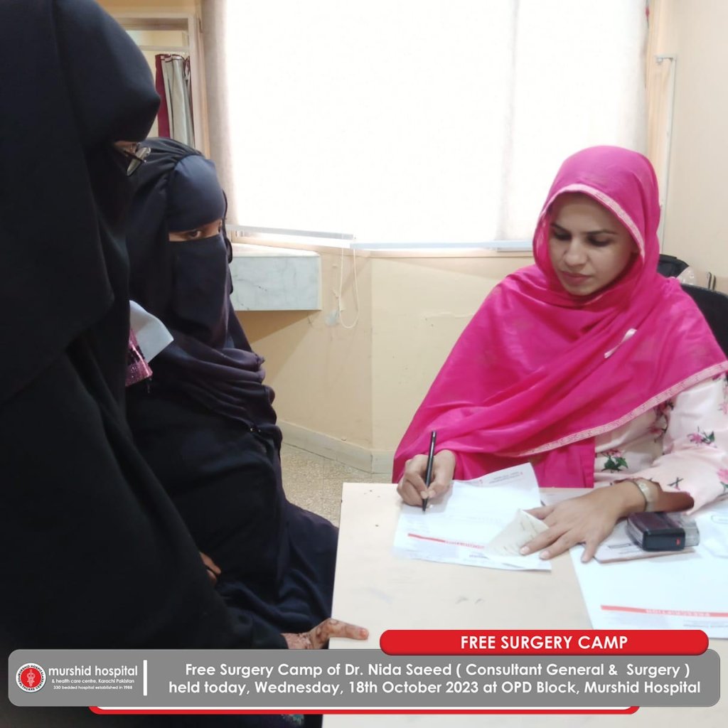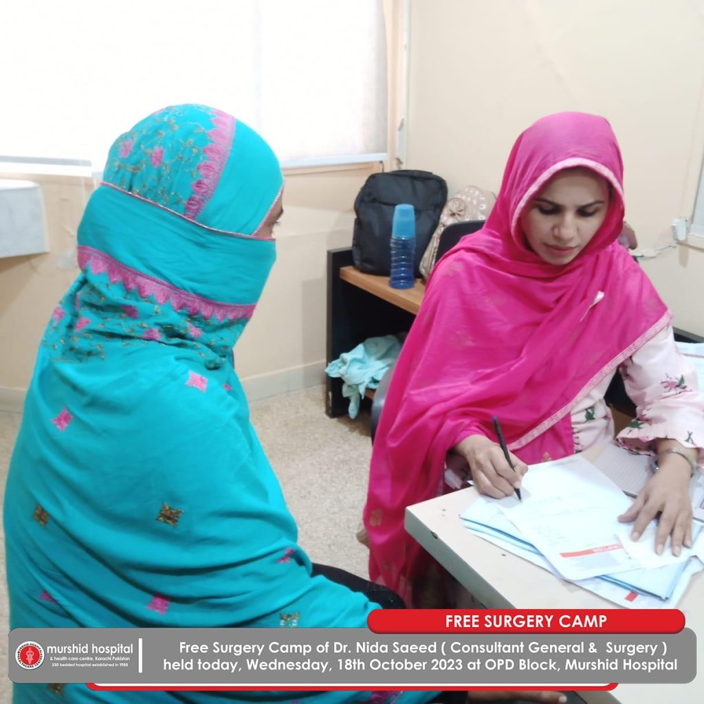 October 18, 2023 Comment: 0 Uncategorized Free Surgery Camp of Dr. Nida Saeed (Consultant General & Surgery) held today, Wednesday, 18th October 2023 at OPD Block, Murshid Hospital .