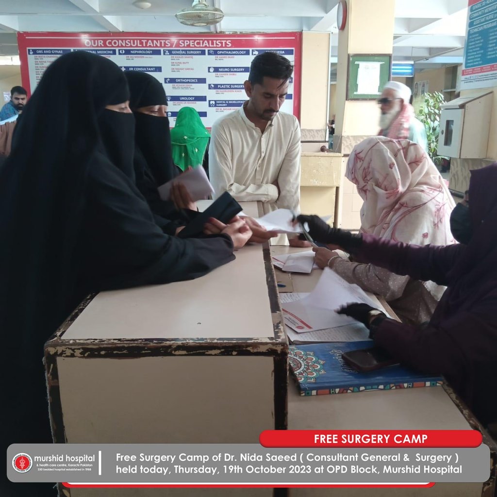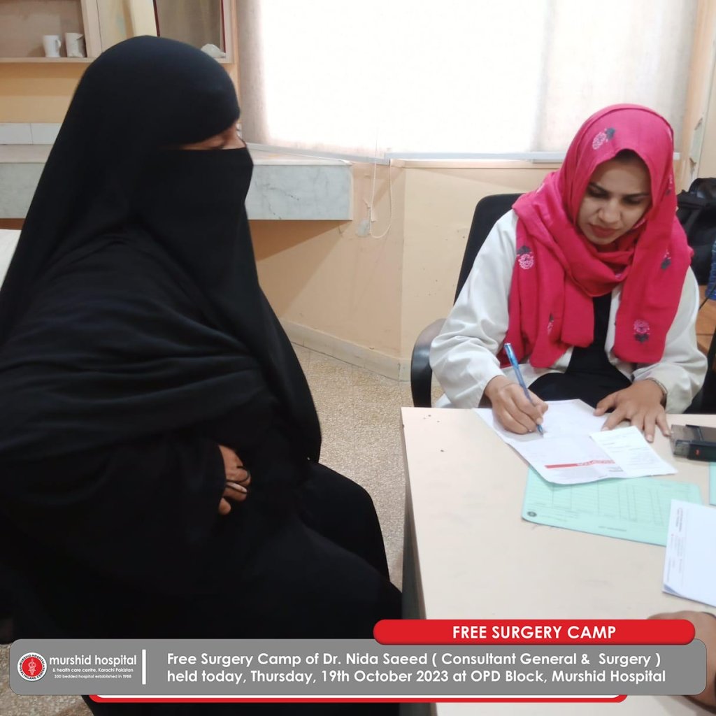 October 19, 2023 Comment: 0 Uncategorized Free Surgery Camp of Dr. Nida Saeed ( Consultant General & Surgery )held today, Thursday, 19th October 2023 at OPD Block, Murshid Hospital