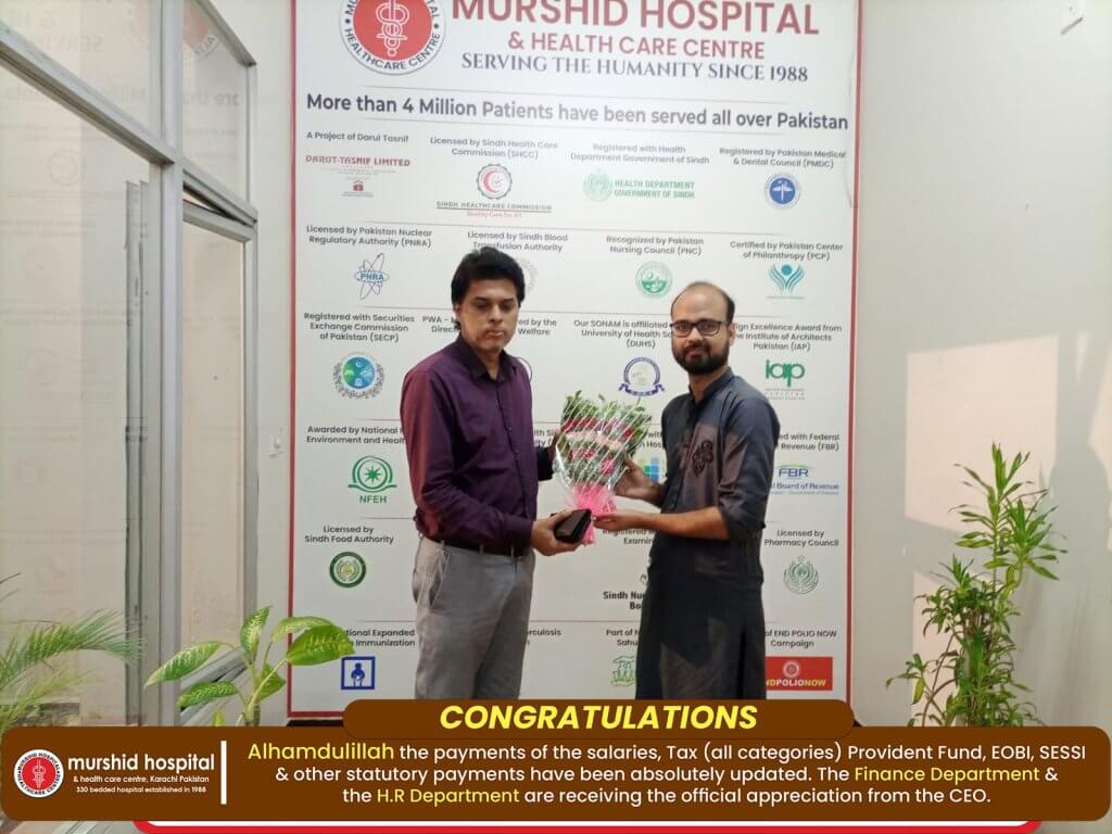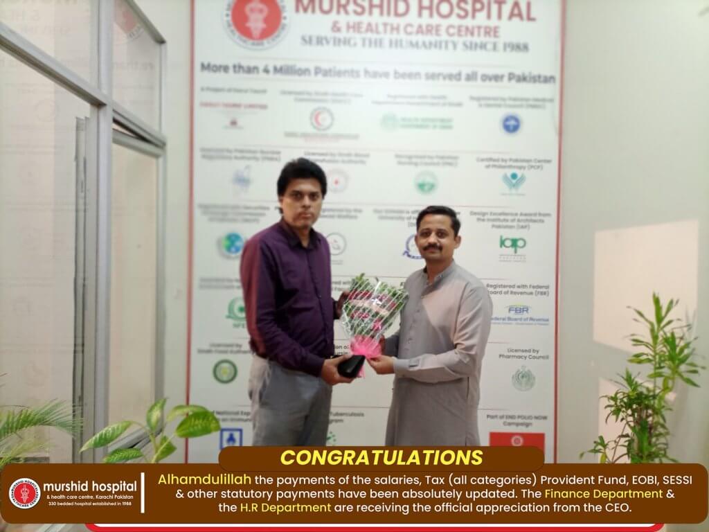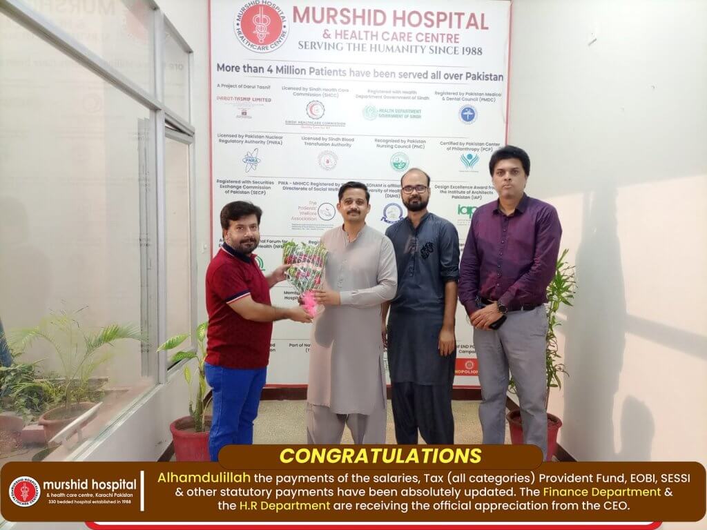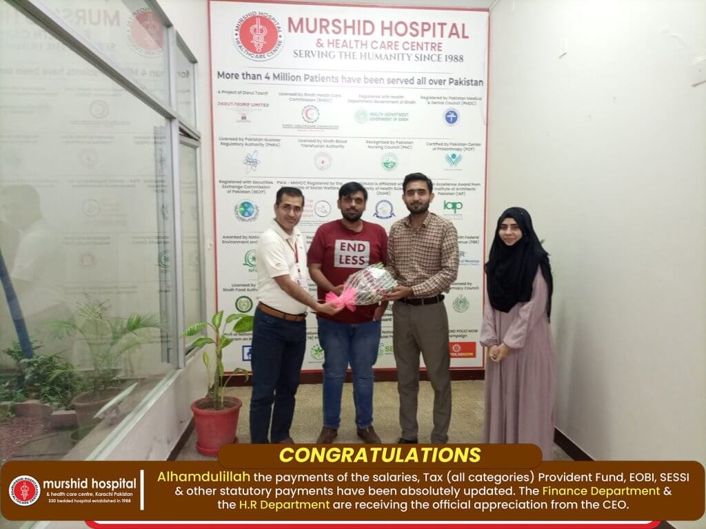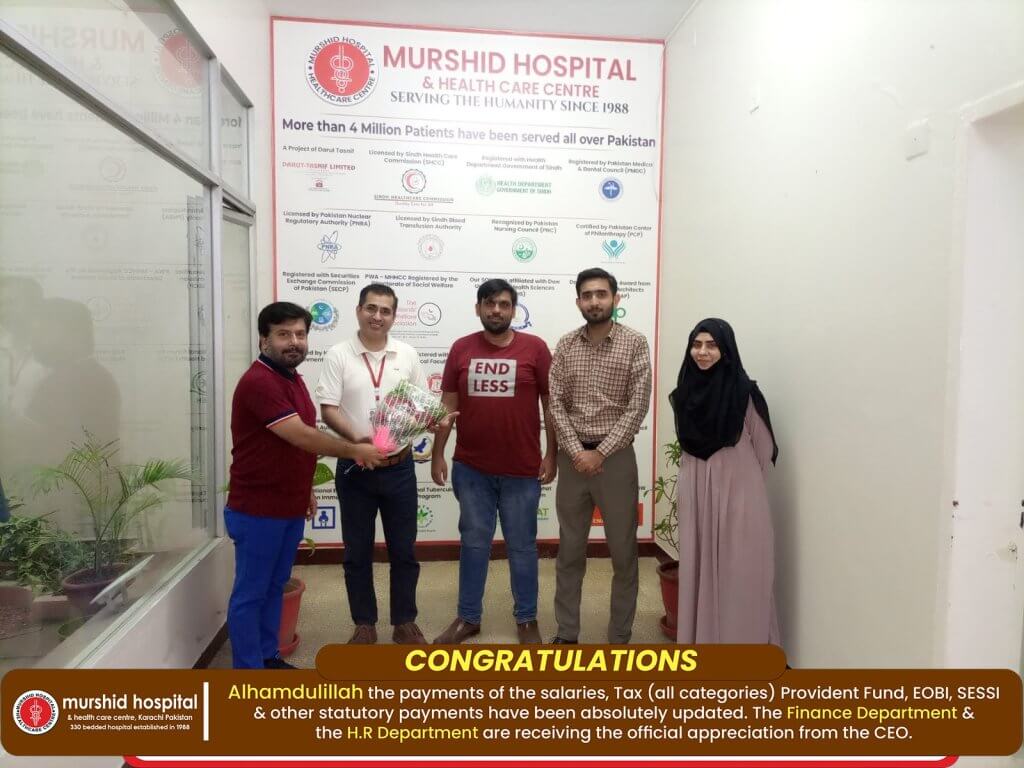 CONGRATULATIONS, Alhamdulillah the payments of the salaries, Tax (all categories) Provident Fund, EOBI, SESSI & other statutory payments have been updated. The Finance Department & HR Department are receiving official appreciation from the Chief Executive Officer.