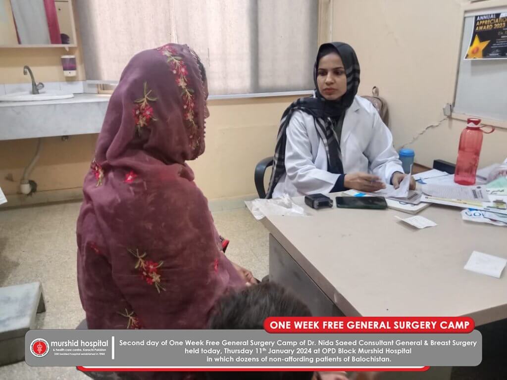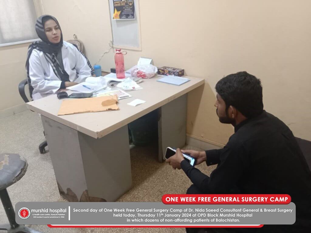 January 11, 2024 Nadeem Sarwar Comment: 0 Uncategorized Second day of One Week Free General Surgery Camp of Dr. Nida Saeed Consultant General & Breast Surgery held today, Thursday 11th January 2024 at OPD Block Murshid Hospital in which dozens of non-affording patients of Balochistan.