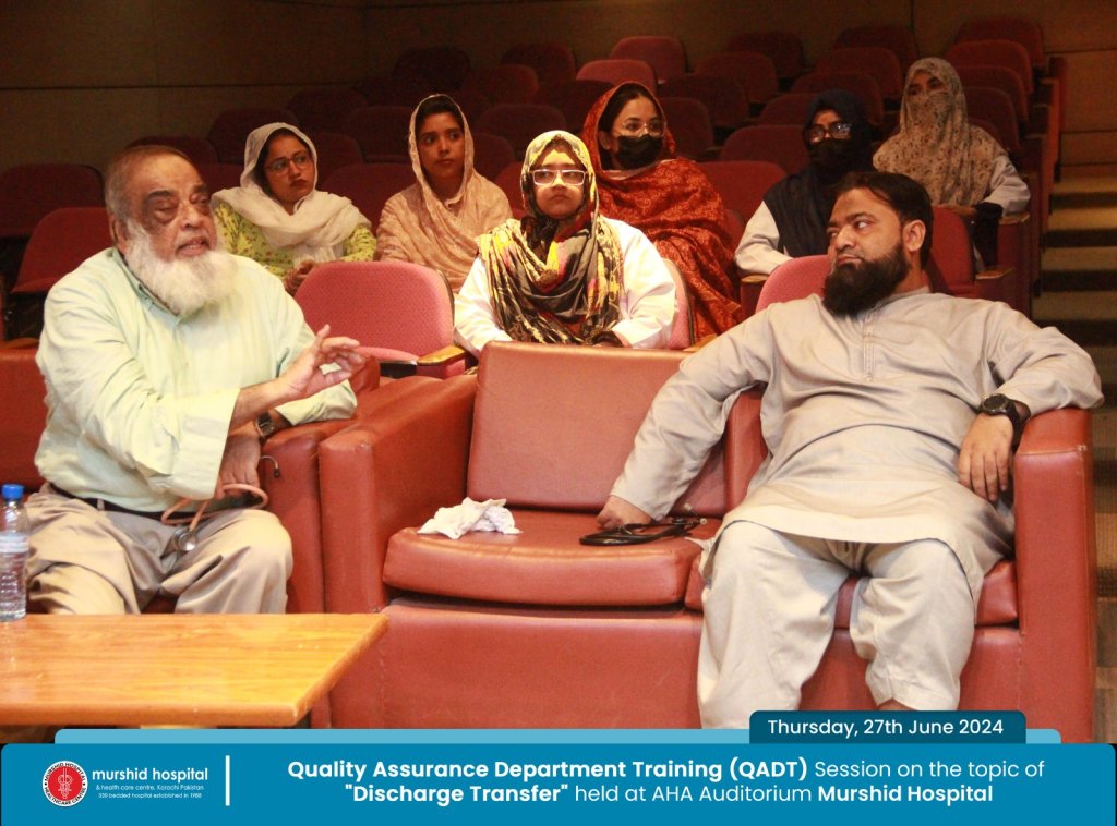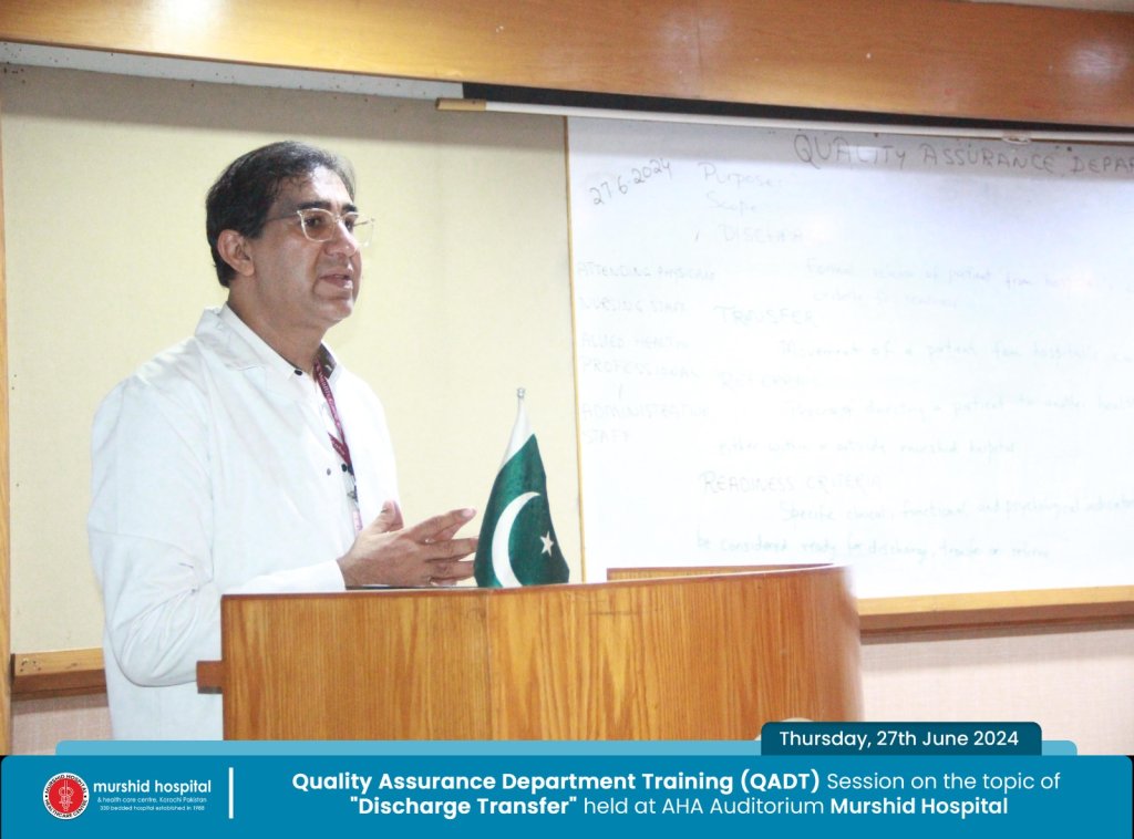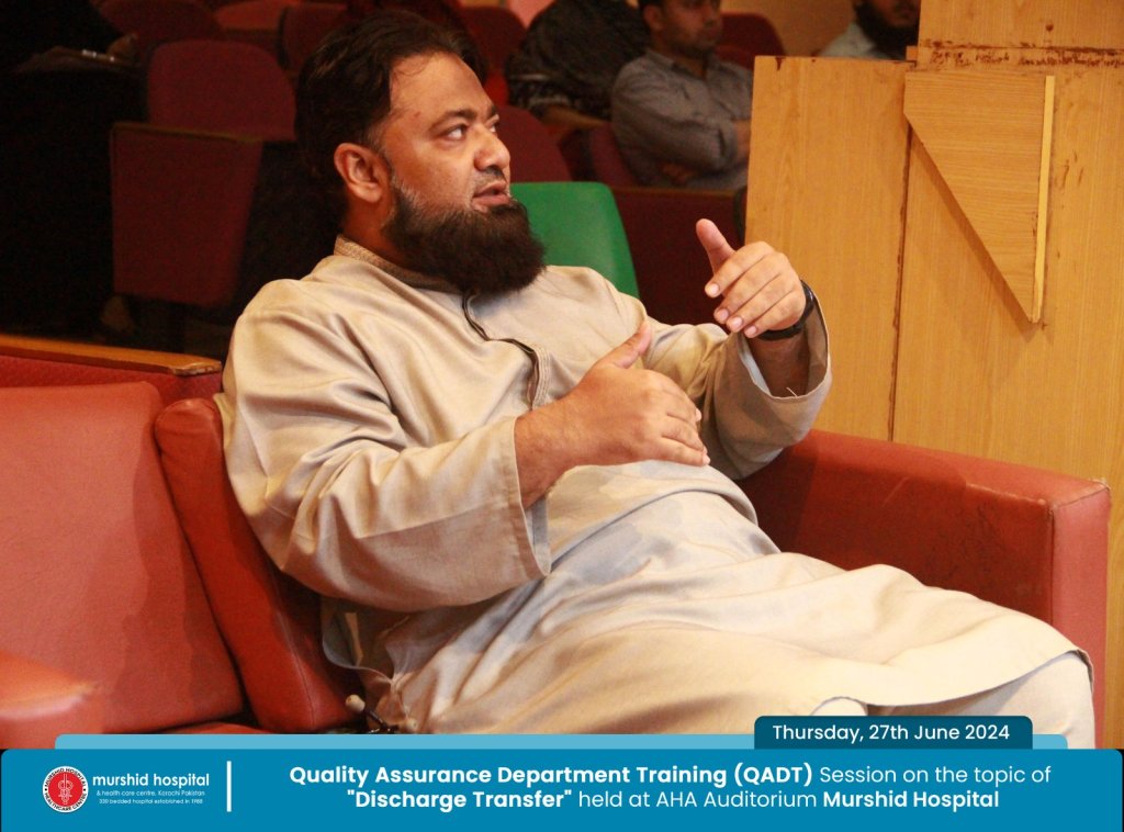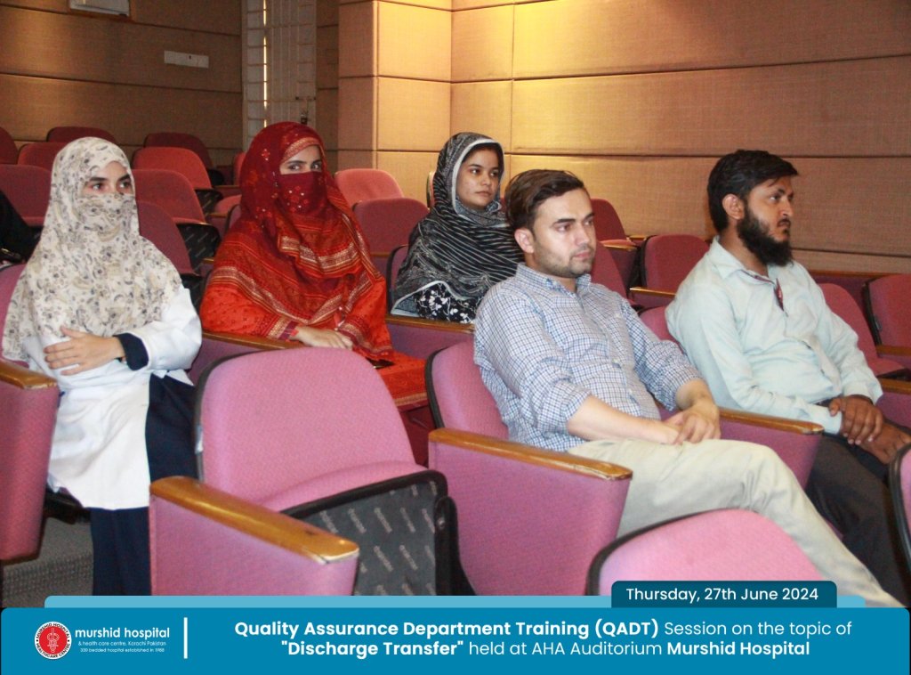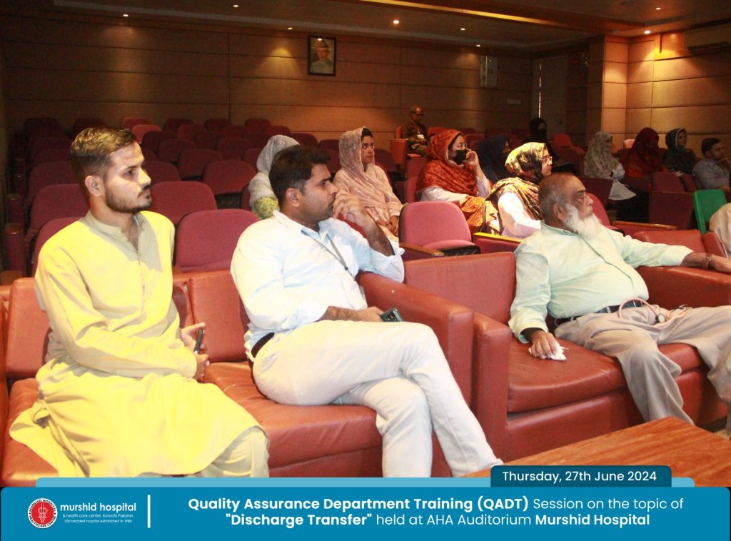June 27, 2024 Nadeem Sarwar Comment: 0 Uncategorized Quality Assurance Department Training (QADT) Session on the topic of “Discharge Transfer” held Today, Thursday, 27th June 2024 at AHA Auditorium Murshid Hospital