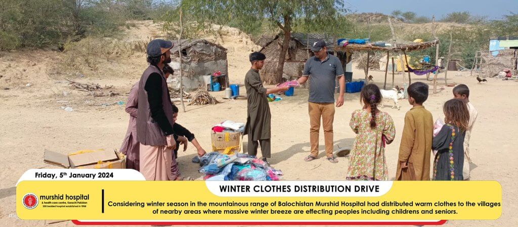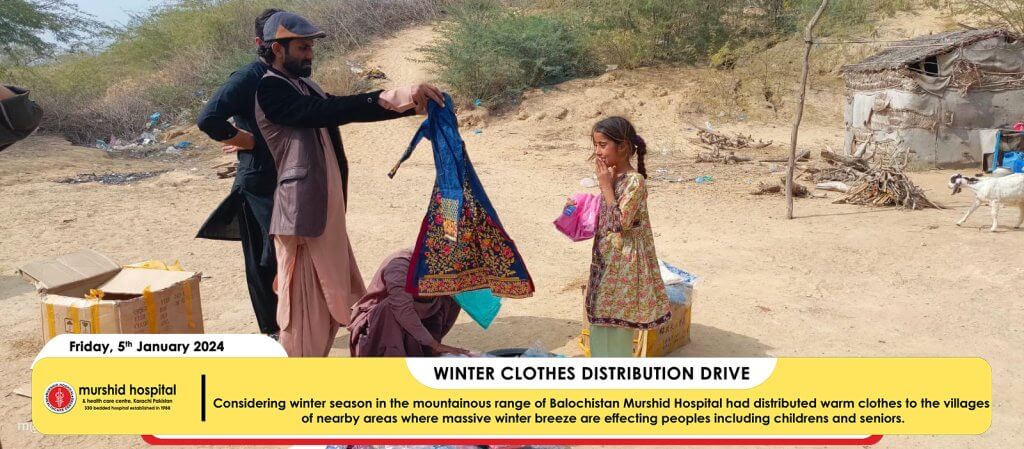 January 5, 2024 Nadeem Sarwar Comment: 0 Uncategorized Considering winter season in the mountainous range of Balochistan Murshid Hospital had distributed warm clothes to the villages of nearby areas where massive winter breeze are effecting peoples including childrens and seniors.